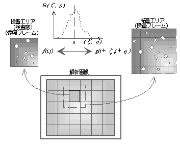 Particle Image Velocimetryの略で、文字通り何個かの粒子をイメージとしてとらえ(言いかえると濃淡分布としてとらえ)、時刻毎の移動量から流速ベクトルを算出するアルゴリズムです。可視化画像の濃淡分布は、2枚の画像の撮影時間間隔は非常に短いために濃淡分布のパターンは殆ど変化しません。ですから画像を縦横いくつかのメッシュに分割し、その1つの小さな領域について次の時刻の画像から最も似ている濃淡分布領域を探せばいいわけです。他にもPTV(Particle