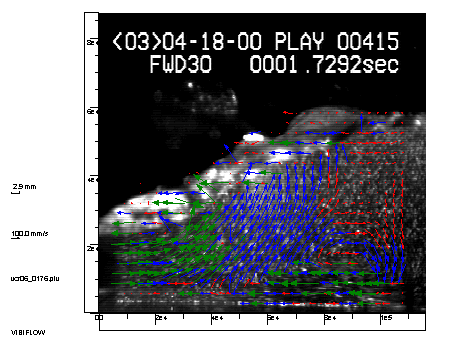高速ビデオカメラで撮影された画像にベクトル図をoverlayした図です。画面に向かって左が岸側になり斜面は1/30勾配、波の周期を7.0(s)に設定していますので1秒間に240枚のフレームを取得した場合、1周期あたり1680枚の可視化画像が得られるわけです。その中でも流体が渦を巻いている様子がよく分かる一枚を取り上げました。ちょうどこの瞬間は岸(左)の方から引き波が、沖(右)の方から打ち上げ波の前面を登る様子が確認できます。得られる画像はモノクロ画像でシャッタースピードを最大1/10000(s)で撮影することが可能ですから、素早い流体の動きもしっかりと捉えることが可能です。画像の白い部分は注入したトレーサー粒子でこの粒子の挙動を時々刻々と追いながら流体内部の動きを観察するわけです。